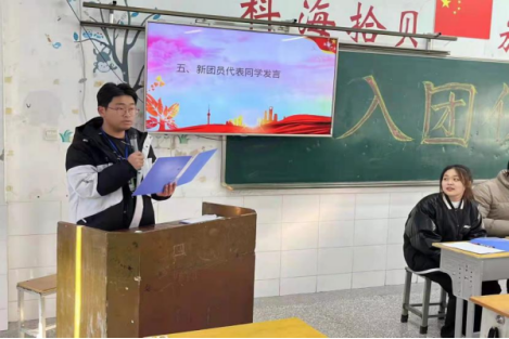 191601班的王鹏同学作为新团员代表发言,他表示要在各方面不断提高自身素养,时时处处发挥模范带头作用,号召全体新团员发扬共青团优良传统,在学习生活中勤奋努力,积极进取,争做优秀的共青团团员。