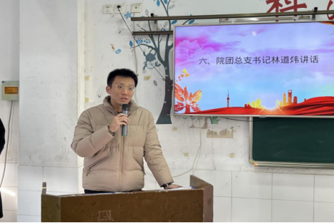 院团总支书记林道炜老师寄语新团员,表示很高兴在这里见证一批优秀青年的成长和进步,对46位新团员表示热烈的欢迎和衷心的祝贺,勉励大家继承和发扬中华民族的优良传统,培养责任意识和感恩意识,珍惜时光,积极向上,为迎来明年团的百岁生日献礼,为实现中华民族的伟大复兴贡献青年力量。