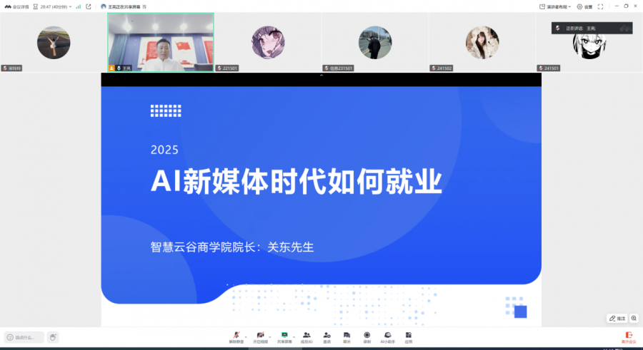 2025年6月22日下午,信息工程学院特邀杭州智慧云谷商学院院长关东先生,为人工智能专业全体学生开展了一场主题为“AI新媒体时代如何就业”的线上讲座。本次讲座旨在帮助同学们了解人工智能行业的最新发展趋势,掌握新媒体时代的就业技能,为未来的职业发展提前规划。