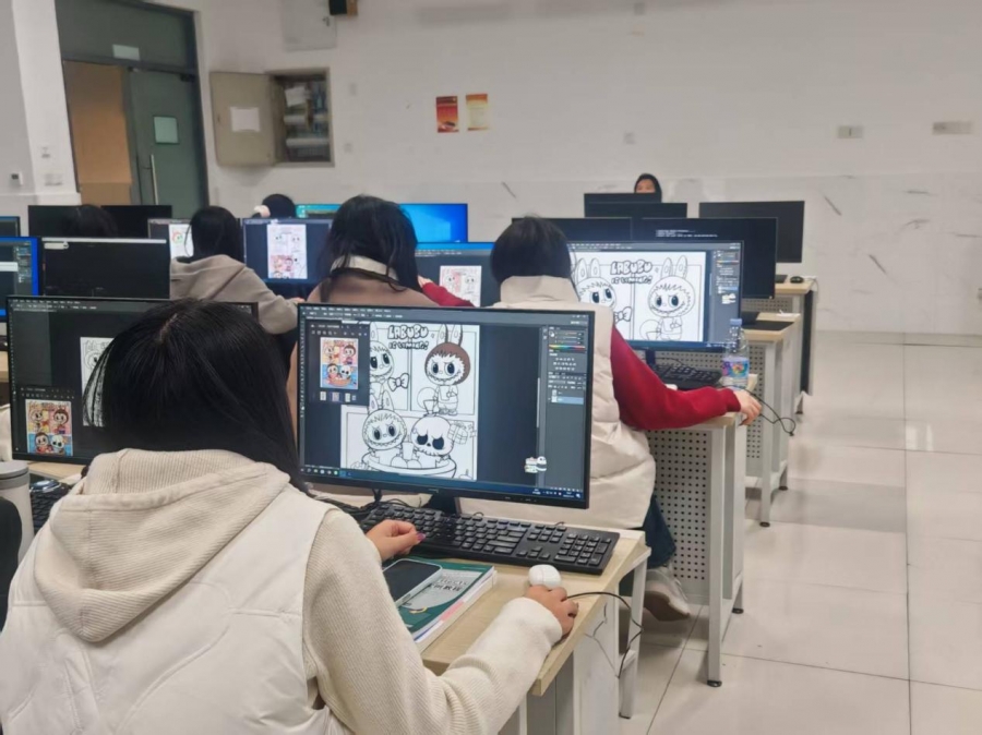 插画设计社团活动室内,同学们端坐电脑前,开启数字涂色创作之旅。大家运用绘图软件,选取喜爱的色彩为线稿填充活力,在鼠标的点击与拖拽中,一个个生动形象、色彩斑斓的插画作品逐渐成型,充分展现了对艺术的热爱与创作才华。