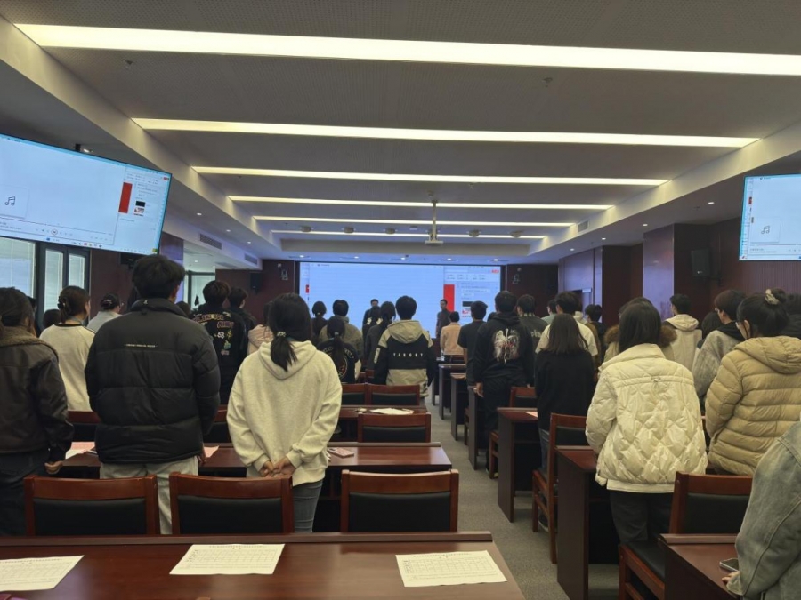 随后,全体参会人员起立,奏唱中华人民共和国国歌,激昂的旋律回荡在会场,彰显着青年学子的爱国情怀与昂扬风貌。